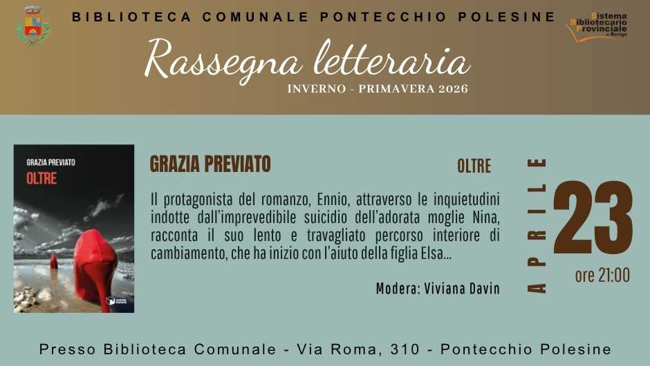 Giovedì 23 aprile ore 21:00 la biblioteca ospita Grazia Previato e il suo nuovo romanzo 'Oltre'.